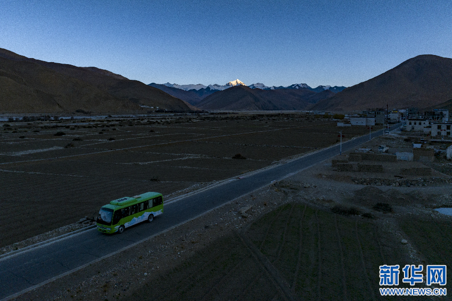 遠處的珠穆朗瑪峰與正在行駛的環(huán)保大巴(無人機照片)。新華網 旦增努布 攝