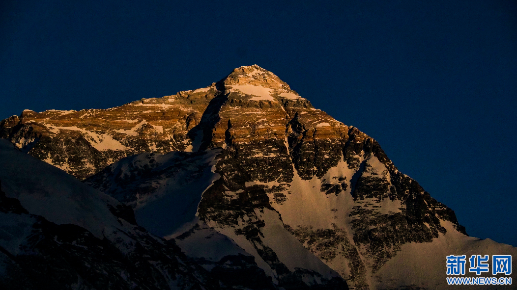 日落時分拍攝的珠穆朗瑪峰。新華網 旦增努布 攝