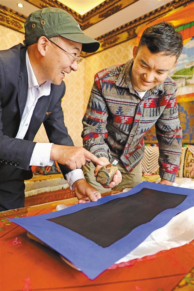 扎西頓珠和徒弟洛桑在藍(lán)青紙上抄寫藏文文獻(xiàn)。