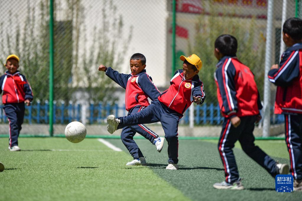 扎西宗鄉(xiāng)完全小學的學生在體育課上踢足球(6月5日攝,無人機照片)。新華社記者 晉美多吉 攝