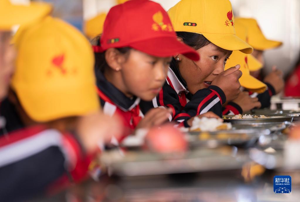 6月5日,扎西宗鄉(xiāng)完全小學的學生在食堂吃午飯。新華社記者 費茂華 攝