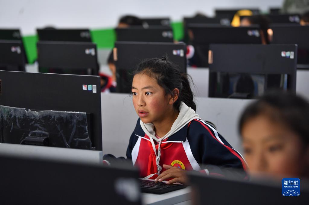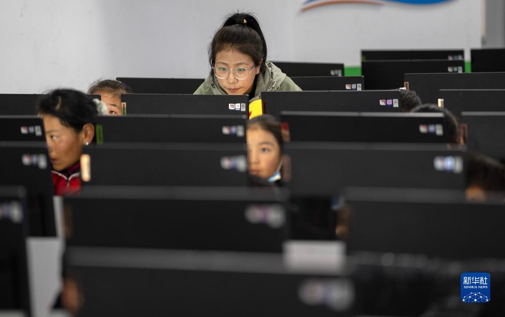6月5日,拉巴卓瑪老師在給扎西宗鄉(xiāng)完全小學六年級的學生上計算機課。新華社記者 費茂華 攝