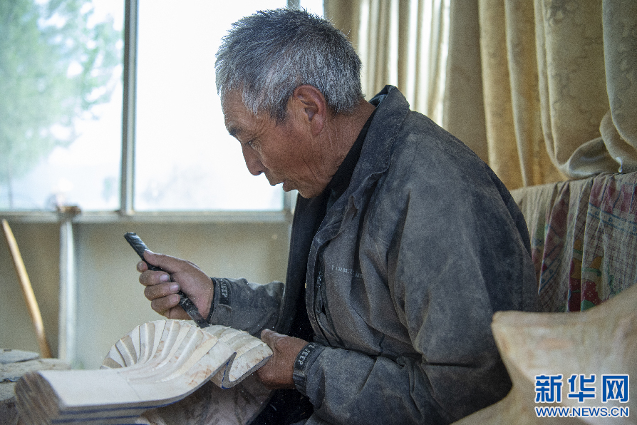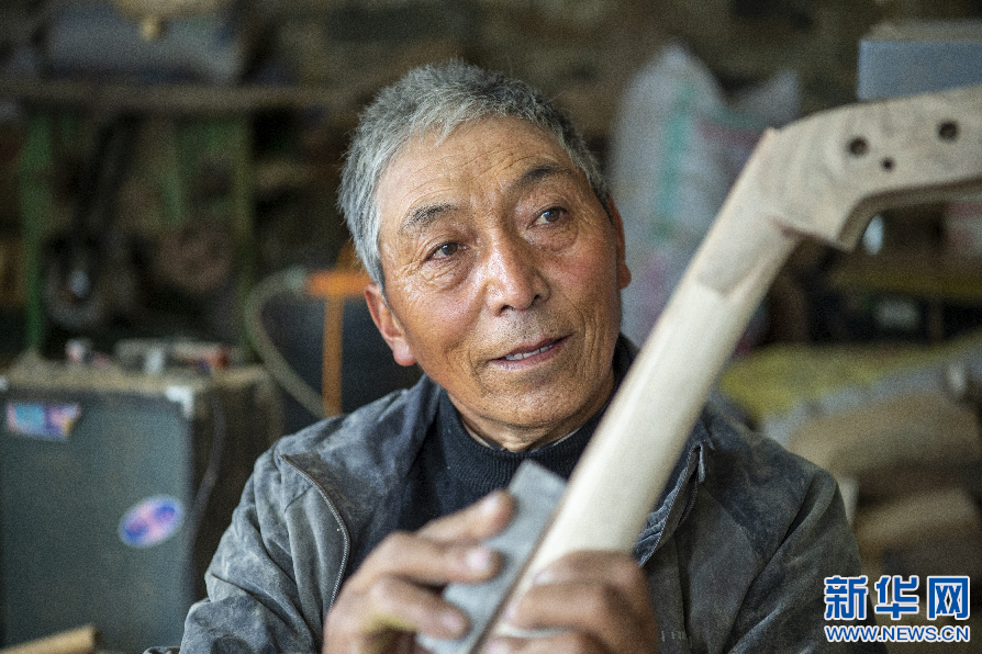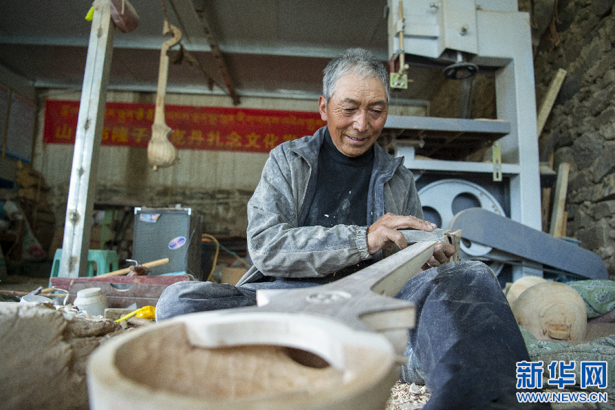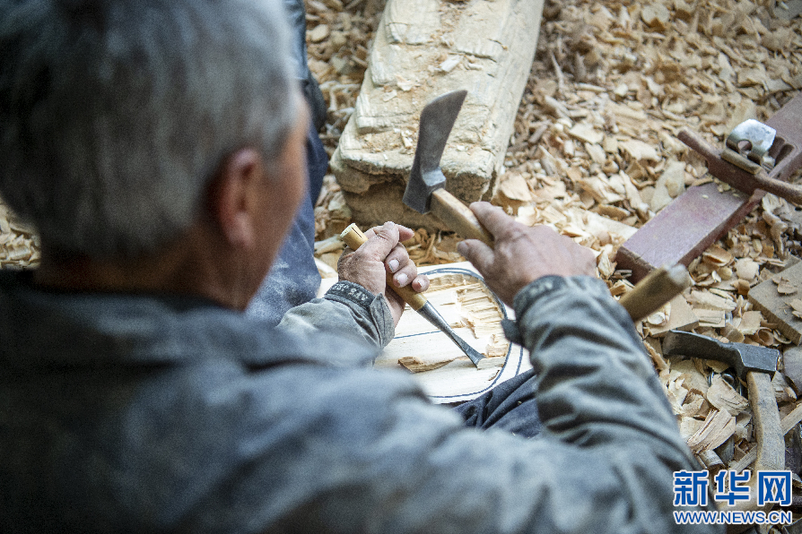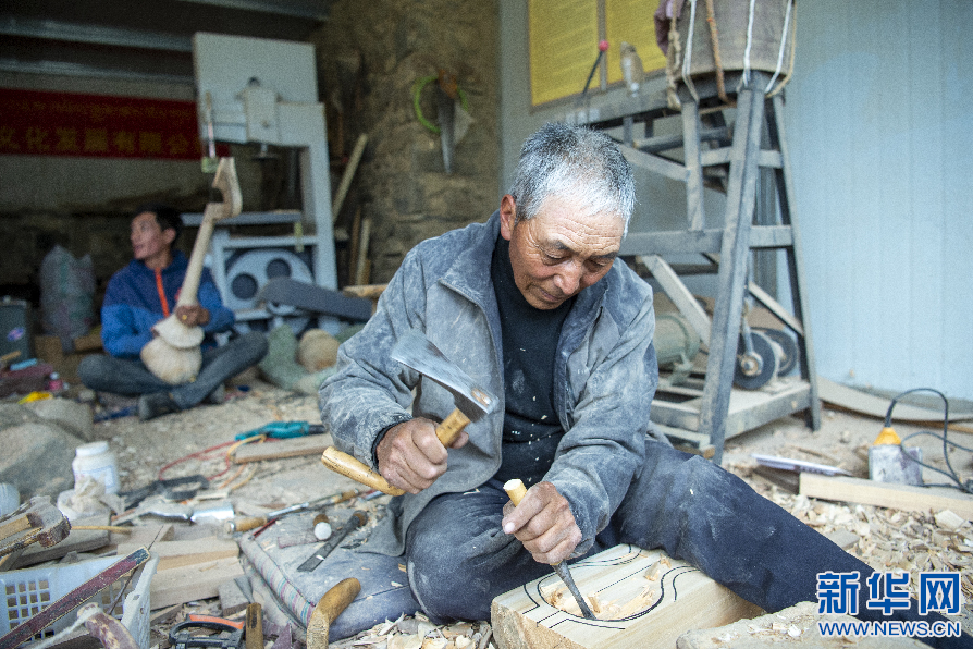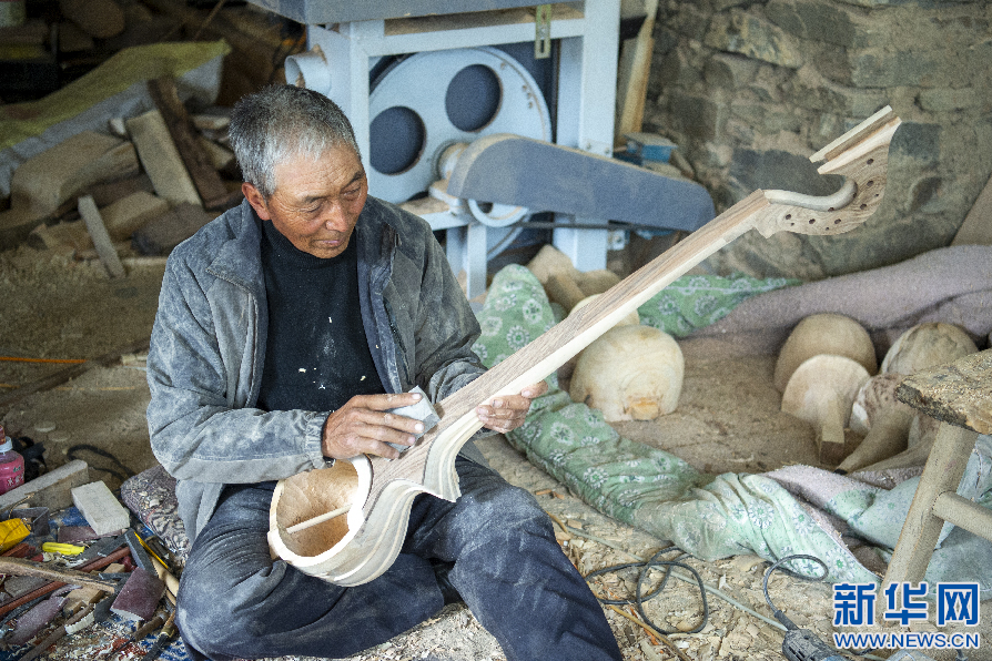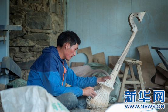 6月8日,娘嘎扎念琴制作技藝傳承人羅布次旦在制作扎念琴。新華網 旦增努布 攝