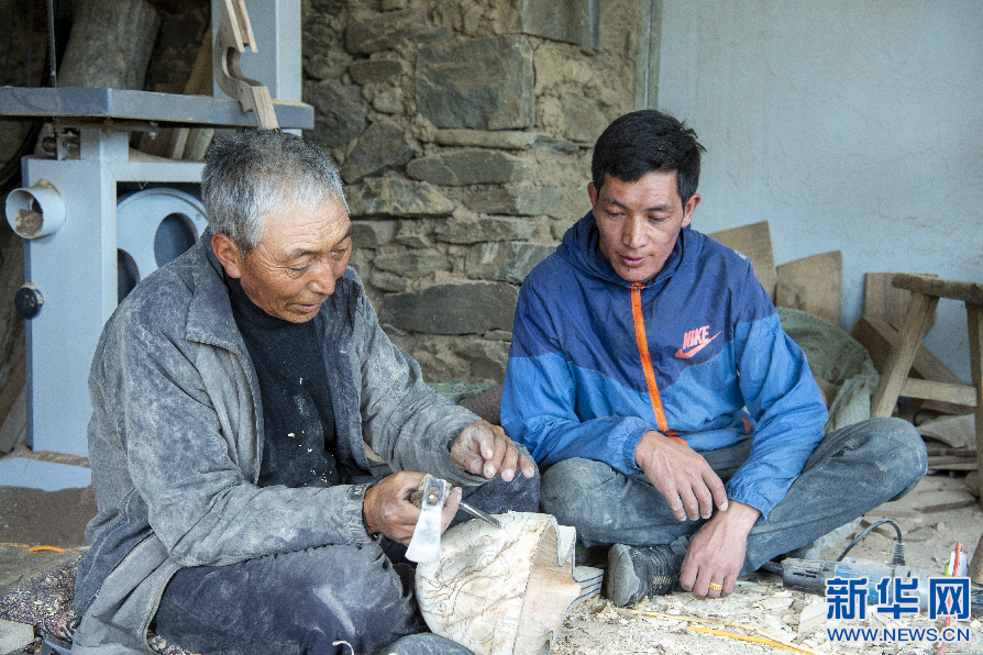 6月8日,娘嘎扎念琴制作技藝傳承人羅布次旦給兒子指導制作技藝。新華網 旦增努布 攝