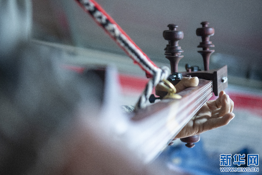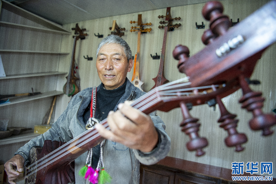 6月8日,娘嘎扎念琴制作技藝傳承人羅布次旦在彈奏扎念琴。新華網 旦增努布 攝