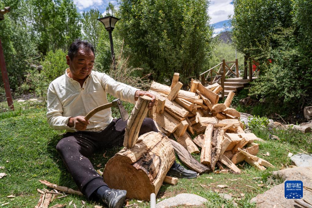 在西藏尼木縣吞巴鎮(zhèn)吞達村,次仁多吉在砍削柏木,為藏香制作準(zhǔn)備原料(6月9日攝)。新華社記者 孫非 攝