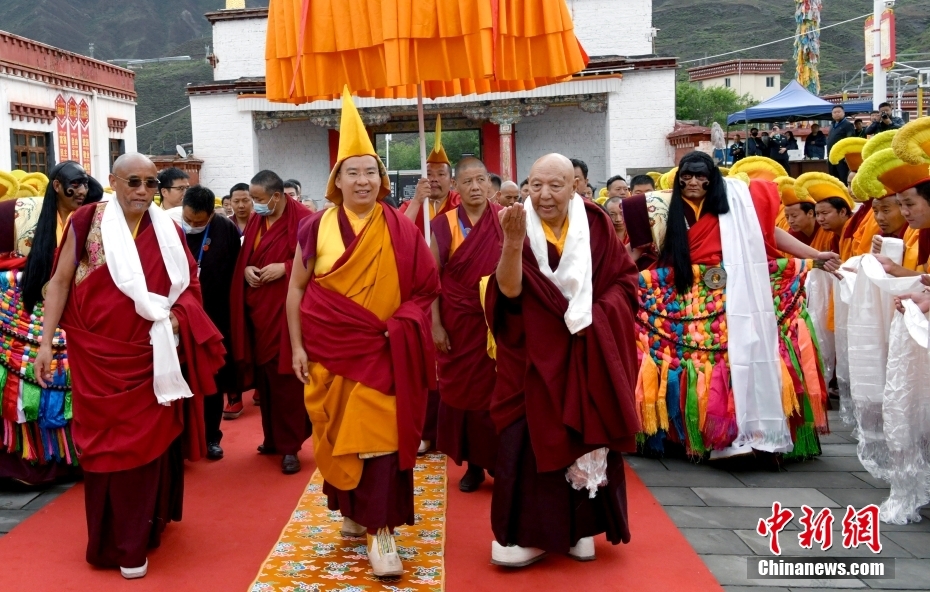 6月12日,全國(guó)政協(xié)常委、中國(guó)佛教協(xié)會(huì)副會(huì)長(zhǎng)、中國(guó)佛協(xié)西藏分會(huì)會(huì)長(zhǎng)班禪額爾德尼·確吉杰布在西藏昌都市強(qiáng)巴林寺禮佛講經(jīng),并為3.6萬(wàn)余名信眾摸頂賜福。強(qiáng)巴林寺僧眾組成儀仗隊(duì)、焚香、吹響法號(hào),高舉寶傘等,以藏傳佛教最高禮儀迎接班禪。強(qiáng)巴林寺為藏傳佛教格魯派創(chuàng)始人宗喀巴弟子向森·西繞桑布創(chuàng)建于15世紀(jì),因寺內(nèi)主供強(qiáng)巴(彌勒)佛而得名。圖為6月12日,班禪抵達(dá)西藏昌都市強(qiáng)巴林寺,僧眾組成儀仗隊(duì)、焚香、吹響法號(hào),高舉寶傘等,以藏傳佛教最高禮儀迎接班禪。