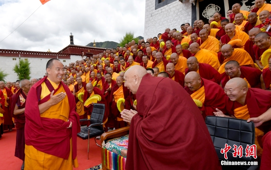 圖為6月12日,班禪與西藏昌都強(qiáng)巴林寺僧眾合影。