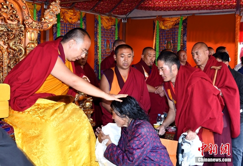 圖為6月12日,班禪在西藏昌都強(qiáng)巴林寺為信眾摸頂賜福。