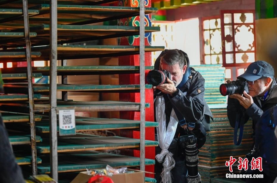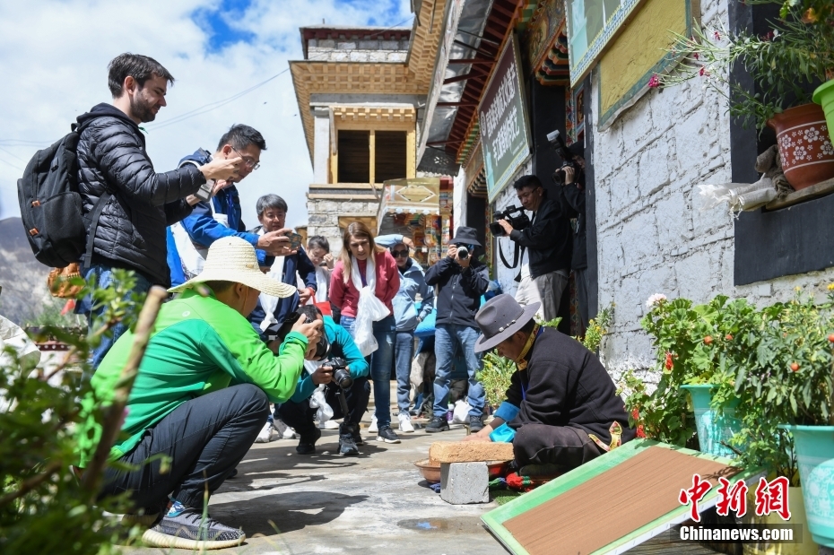 6月15日,西藏拉薩,記者們?cè)谀崮究h非遺工坊(藏紙制作廠)采訪拍攝。在第五屆中國西藏旅游文化國際博覽會(huì)召開之際,國務(wù)院新聞辦組織中外媒體記者赴西藏采訪,路透社、共同社、西班牙埃菲社、意大利安莎社、新加坡《聯(lián)合早報(bào)》和中央廣電總臺(tái)、中國日?qǐng)?bào)等15家媒體的20名記者參加。6月15日,采訪團(tuán)一行前往拉薩市尼木縣參訪體驗(yàn)西藏傳統(tǒng)藏香、藏紙文化。