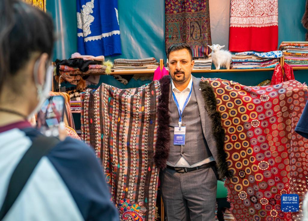 6月17日,來自印度的參展商在第五屆藏博會現(xiàn)場向顧客展示披肩。新華社記者 孫非 攝