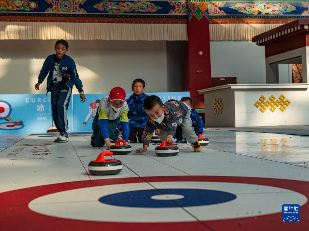6月17日,幾名孩子在第五屆藏博會現(xiàn)場體驗冰壺。新華社記者 孫非 攝