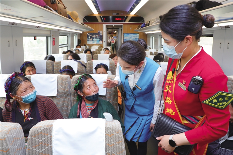 2022年初,青藏集團有限公司在管內(nèi)各站、車開展“天路格桑花”品牌創(chuàng)建以來,拉林鐵路各車站、各次列車上都能看到“天路格桑花”服務(wù)隊員,他們用真誠、熱情、熱心為每一位旅客提供溫馨細致的服務(wù)。“6月初,我?guī)е⒆觼砦鞑芈糜危?月20日前往林芝,游玩了三天,由于家里有事,不得不趕回去,就買了今天中午回拉薩的火車票,剛開車不久我姑娘就發(fā)燒,肚子痛。列車員看見孩子難受就詢問情況,并找來列車長周晶,通過廣播為我們找醫(yī)生,還好沒啥大事,就是腸胃感冒,我也就放心了。周晶車長也一直在旁邊幫我照顧孩子,拿濕毛巾擦臉,蓋毛毯,送來熱水,太細心了,讓我很感動。她們工作認(rèn)真負(fù)責(zé),服務(wù)周到,我一路上都親身感受到了高原動車的熱情?!痹?4日林芝到拉薩的C926次列車上,來自四川的高雅女士拉著記者激動地說。