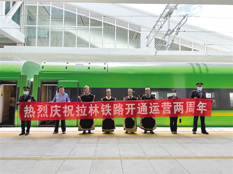 2021年6月25日,拉林鐵路開通運營,結(jié)束了藏東南不通鐵路的歷史,復(fù)興號動車開到西藏,駛上拉林鐵路,拉薩至山南、林芝最快1小時4分、3小時30分可達;山南至林芝最快2小時22分可達,相比汽車,從拉薩到林芝的時間幾乎節(jié)省了一半,從山南到林芝,也節(jié)省了2個多小時。兩年來,隨著運行方式逐漸成熟,鐵路方便、快捷的運輸優(yōu)勢逐步顯現(xiàn),客流持續(xù)攀升,青藏集團有限公司及時根據(jù)客流情況在周末、節(jié)假日、寒暑假等客流高峰期增開281趟臨時旅客列車。兩年來,拉林鐵路共運送旅客182.5萬人次,運輸貨物41.91萬噸,拉近了藏東南地區(qū)9個城市的距離,也深刻改變了當(dāng)?shù)厝嗣竦墓ぷ骱蜕钣^念。