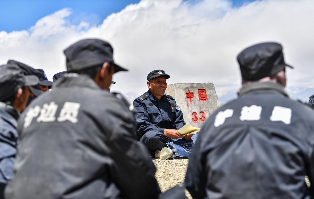 在33號界碑處,護(hù)邊隊在隊長的帶領(lǐng)下開展學(xué)習(xí)(6月2日攝)。新華社記者 晉美多吉 攝