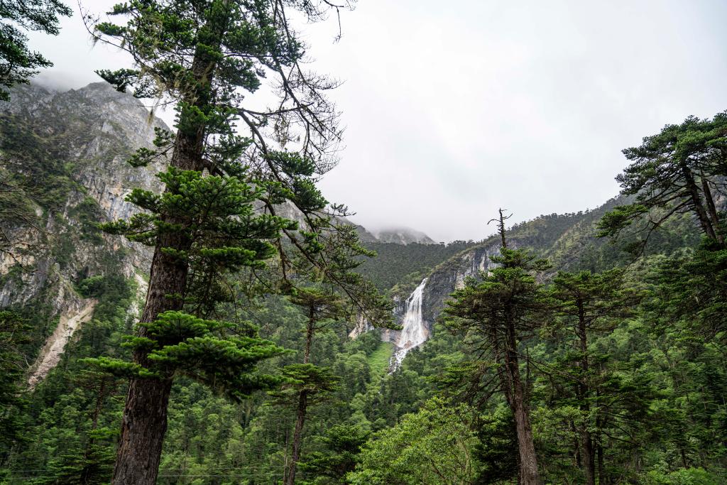 杰羅布村附近拍攝的森林和瀑布(7月1日攝)。新華社記者 孫非 攝