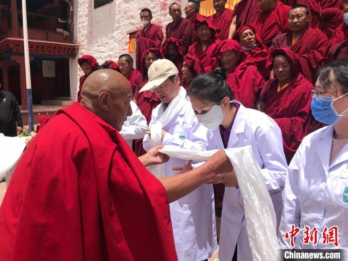 “同心·共鑄中國心”2023西藏昌都行大型醫(yī)療公益活動(dòng)正在昌都舉行。當(dāng)天,來自首都醫(yī)科大學(xué)附屬北京佑安醫(yī)院、北京老年醫(yī)院、北京大學(xué)首鋼醫(yī)院的醫(yī)療專家來到邊壩寺開展免費(fèi)義診、愛心物資捐贈(zèng)等活動(dòng)。專家們抵達(dá)寺廟后,僧眾和邊壩寺管委會(huì)工作人員為他們獻(xiàn)上了哈達(dá)。