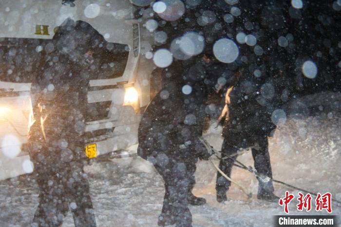2022年2月27日,馬攸橋邊境檢查站民警在在海拔5200多米的馬木拉達(dá)坂救援被困人員和車(chē)輛。馬攸橋邊境檢查站 供圖