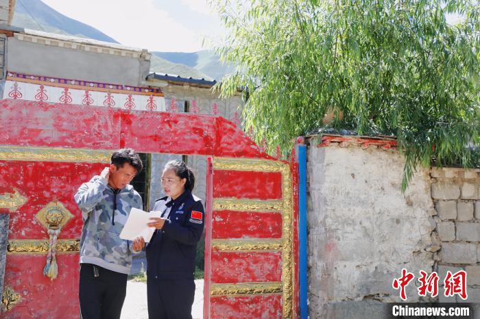 圖為索朗曲珍為鄰居解答戶籍辦理的相關政策。 應俊 攝