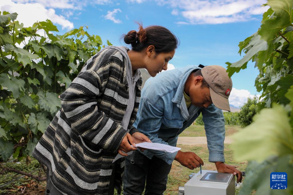 7月26日,桑日縣一家葡萄酒企業(yè)的員工曲珍(左)在葡萄園里向技術員何志榮學習操作光譜儀。新華社記者 姜帆 攝