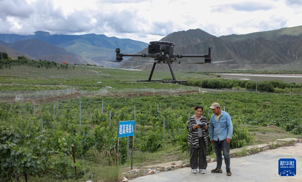 7月26日,桑日縣一家葡萄酒企業(yè)的員工曲珍(左)在葡萄園里向技術員何志榮學習使用農(nóng)用無人機。新華社記者 姜帆 攝