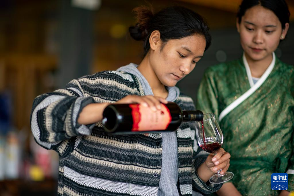 7月26日,桑日縣一家葡萄酒企業(yè)的員工曲珍(左)在跟同事一起練習企業(yè)葡萄酒產(chǎn)品介紹。新華社記者 旦增尼瑪曲珠 攝