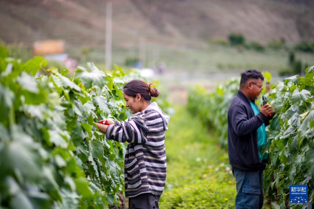 7月26日,桑日縣一家葡萄酒企業(yè)的員工曲珍(左)與同事在為葡萄剪枝。新華社記者 姜帆 攝