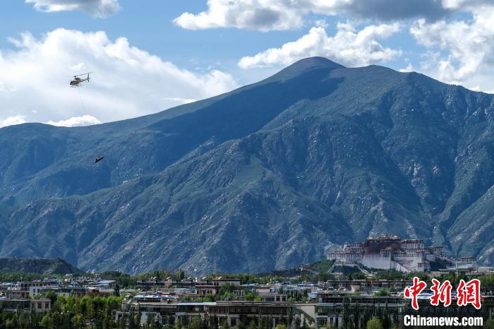 8月8日,空客H125直升機在拉薩上空演示吊裝應急救援設備。中新社記者 江飛波 攝