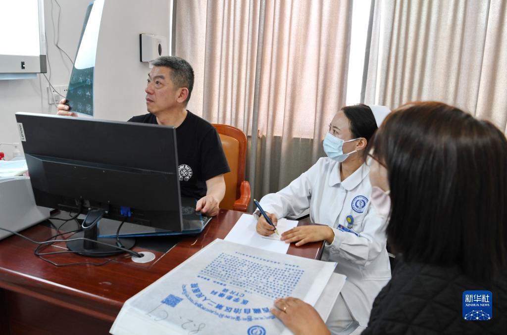 8月10日,北京天壇醫(yī)院神經(jīng)外科學中心主任醫(yī)師隋大立(左)和西藏自治區(qū)第二人民醫(yī)院的醫(yī)生為患者義診。新華社記者 張汝鋒 攝