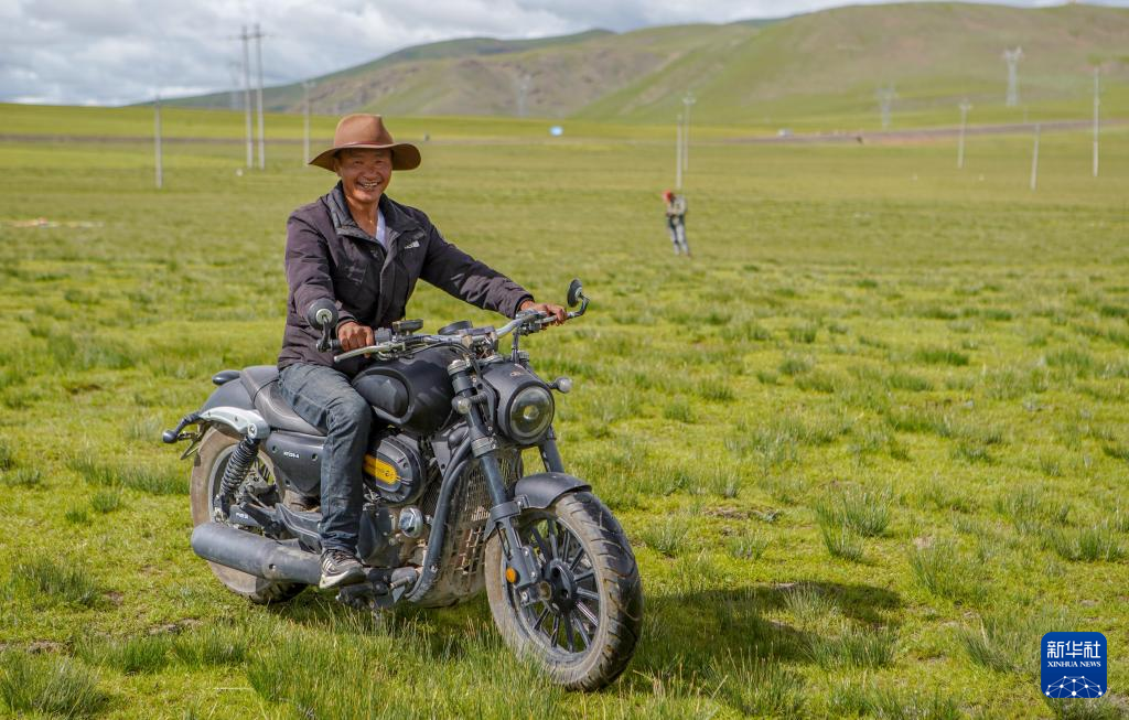 8月11日,次扎達(dá)在羌塘草原上騎摩托車出行。新華社記者 邵澤東 攝?
