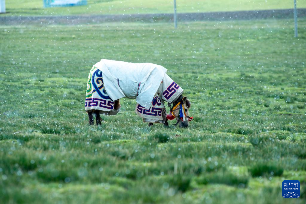 “隆達(dá)熱巴”在雨中吃草,次扎達(dá)給它穿上了厚厚的“衣服”(8月9日攝)。新華社記者 劉文博 攝?