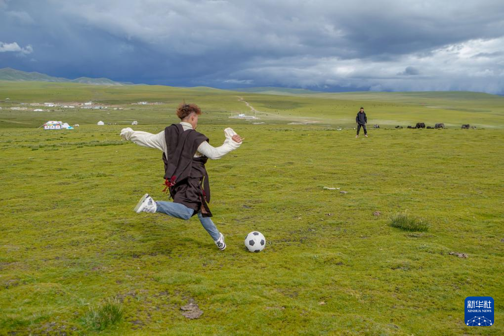 8月11日,旦增旺久和朋友在草原上踢足球。旦增旺久是次扎達(dá)兒子列熱覺旦的表哥,遠(yuǎn)在千里之外的湖南上學(xué),但還會(huì)經(jīng)常想起“隆達(dá)熱巴”。正值暑假,回到草原的他會(huì)細(xì)心地為“隆達(dá)熱巴”梳毛,跟它說悄悄話。新華社記者 邵澤東 攝
