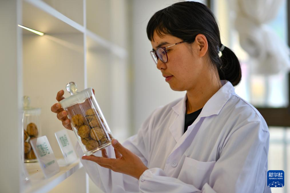 劉利平在長江大學(xué)西藏高原核桃產(chǎn)業(yè)研究所檢查核桃果實標(biāo)本(7月27日攝)。新華社記者 旦增尼瑪曲珠 攝
