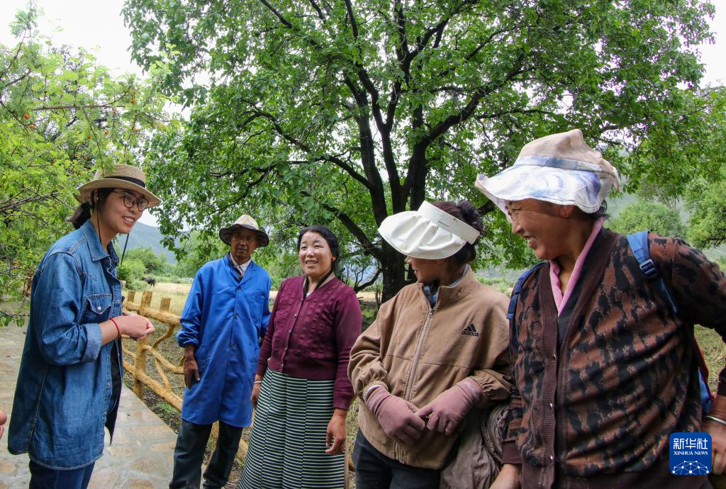 劉利平(左一)在加查縣安繞鎮(zhèn)熱果村與村民交流核桃樹養(yǎng)護技術(shù)(7月27日攝)。新華社記者 姜帆 攝