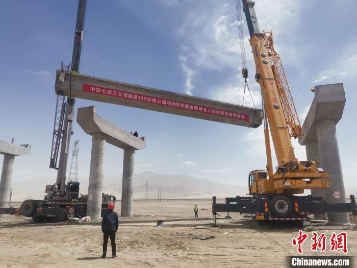 據(jù)介紹,跨青藏鐵路轉(zhuǎn)體橋梁設(shè)計(jì)長度687米,分主橋和引橋兩部分,引橋共設(shè)計(jì)箱梁116片。預(yù)制箱梁架設(shè)屬于高風(fēng)險(xiǎn)施工,本次架設(shè)的首片箱梁設(shè)計(jì)長度20米,重量55噸,采用兩臺(tái)大型汽車吊協(xié)同作業(yè)完成架設(shè)。