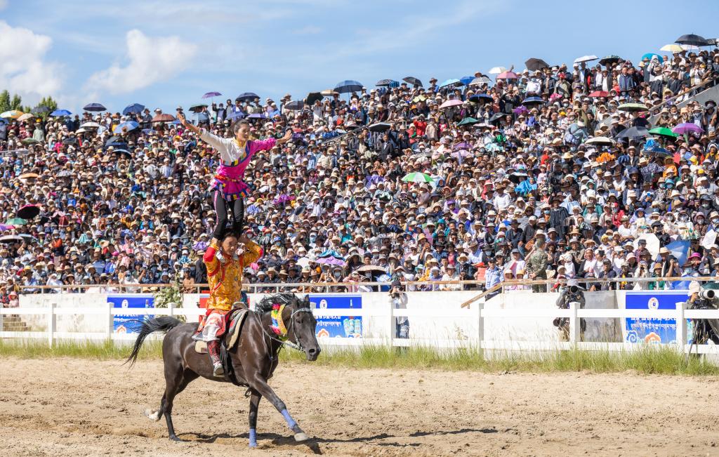 8月17日,2023拉薩雪頓節(jié)賽馬大會現(xiàn)場,兩位騎手正在進(jìn)行單馬雙人表演。新華社記者 丁增尼達(dá) 攝