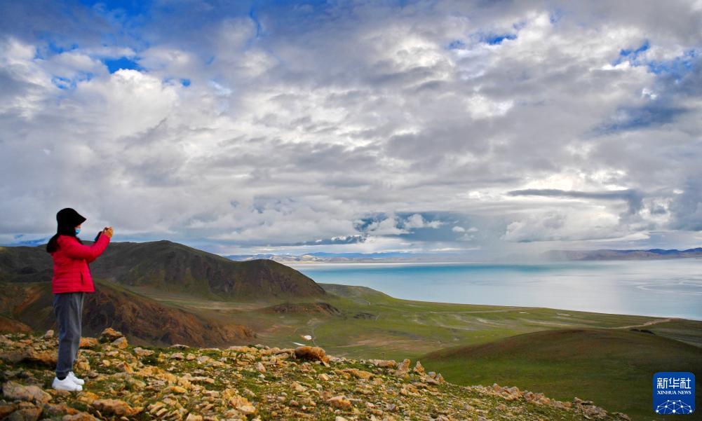 游客在扎日南木錯(cuò)湖畔拍攝(8月19日攝)。新華社記者 張汝鋒 攝