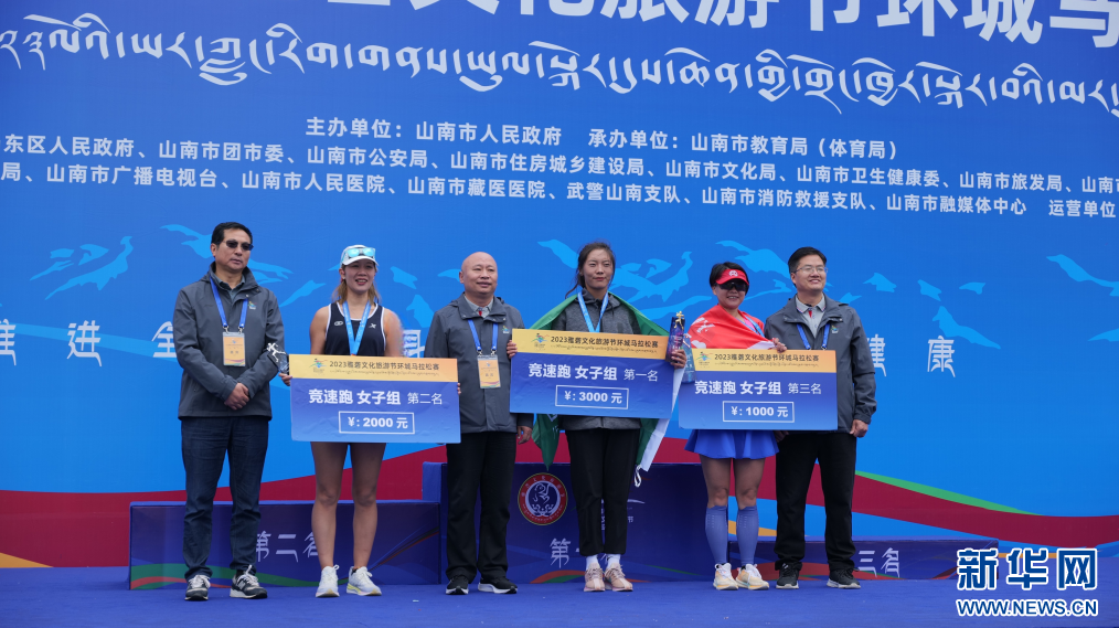 圖為2023雅礱文化旅游節(jié)環(huán)城馬拉松賽競速跑女子組頒獎典禮(8月26日攝)。新華網(wǎng) 柑丹鴦琦 攝