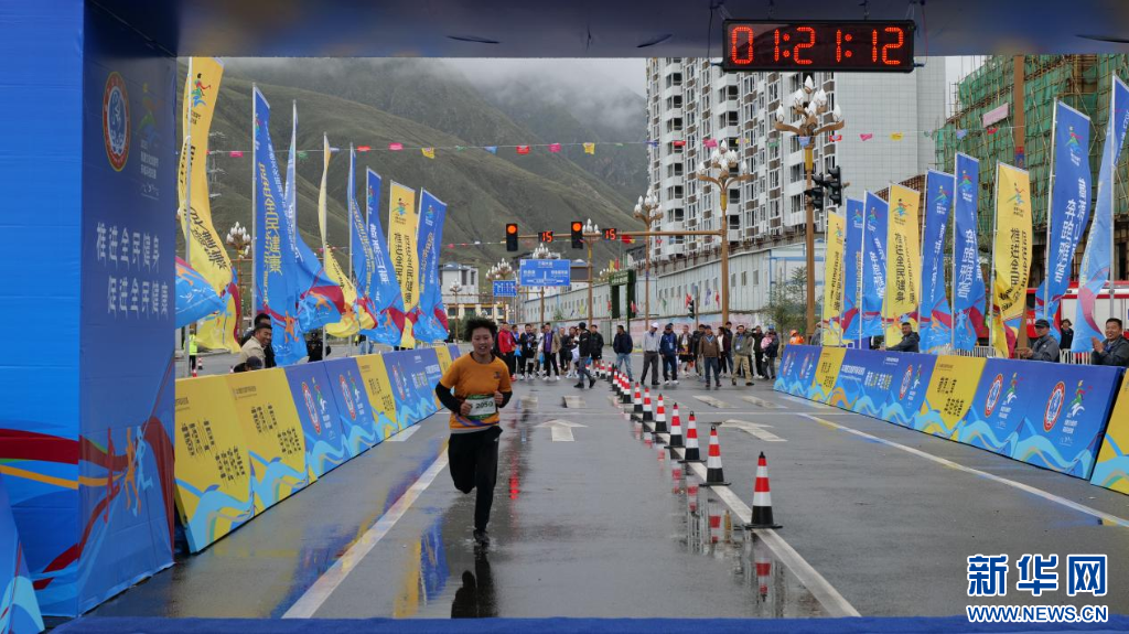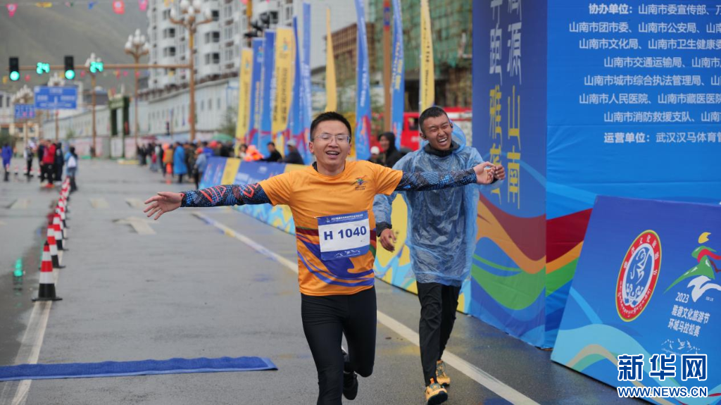 圖為2023雅礱文化旅游節(jié)環(huán)城馬拉松賽選手到達終點(8月26日攝)。新華網(wǎng) 柑丹鴦琦 攝