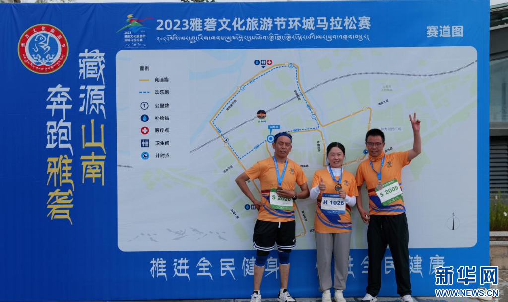 圖為2023雅礱文化旅游節(jié)環(huán)城馬拉松賽參賽選手合影留念(8月26日攝)。新華網(wǎng) 柑丹鴦琦 攝