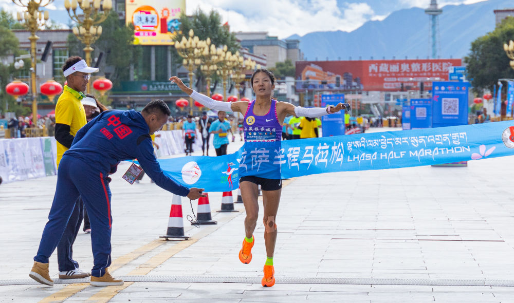 2023拉薩半程馬拉松女子組選手次仁措姆沖線奪冠瞬間。新華社發(fā)(丁增尼達(dá) 攝)