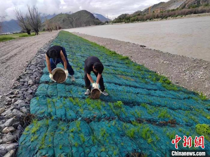 圖為工人們對(duì)生態(tài)袋進(jìn)行養(yǎng)護(hù)。中國(guó)水電基礎(chǔ)局西藏分公司供圖