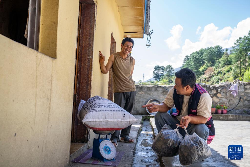 在西藏林芝市察隅縣,一名商販在收購(gòu)“采山人”(左)采集的石耳(9月3日攝)。新華社記者 孫非 攝
