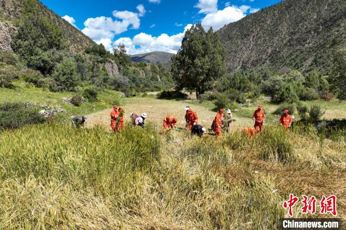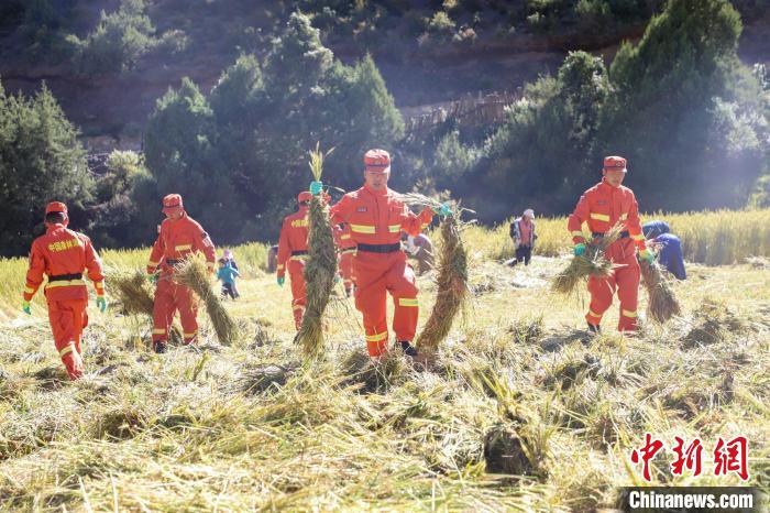 圖為消防員收割后搬運青稞。劉星文 攝