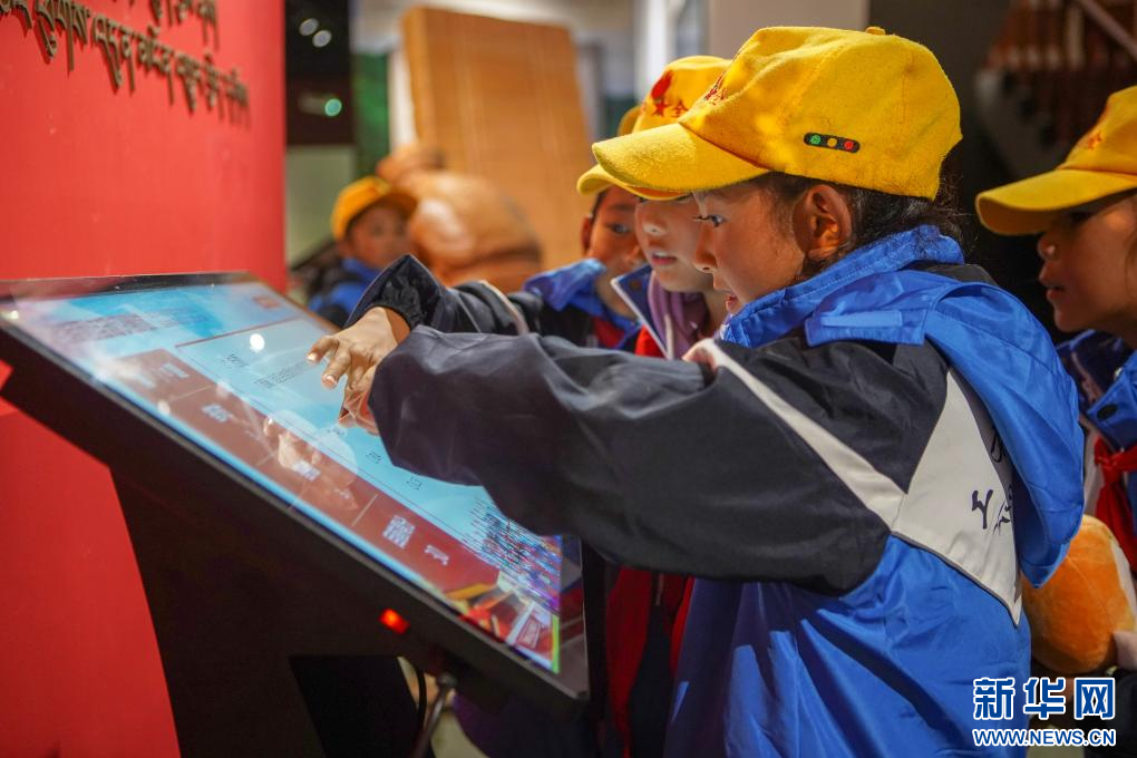 開館儀式當天,當?shù)匦W(xué)學(xué)生圍在館內(nèi)民族團結(jié)知識測試機器前答題。(9月27日攝)新華社記者 黃智琪 攝