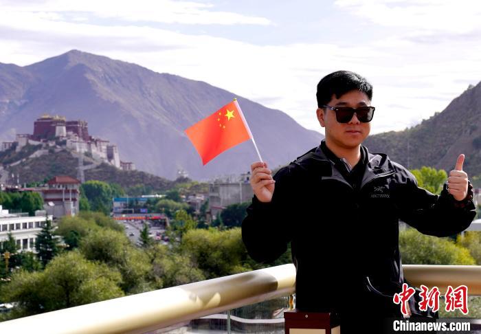 圖為游客在西藏博物館與遠處布達拉宮合影留念。拉巴卓瑪 攝