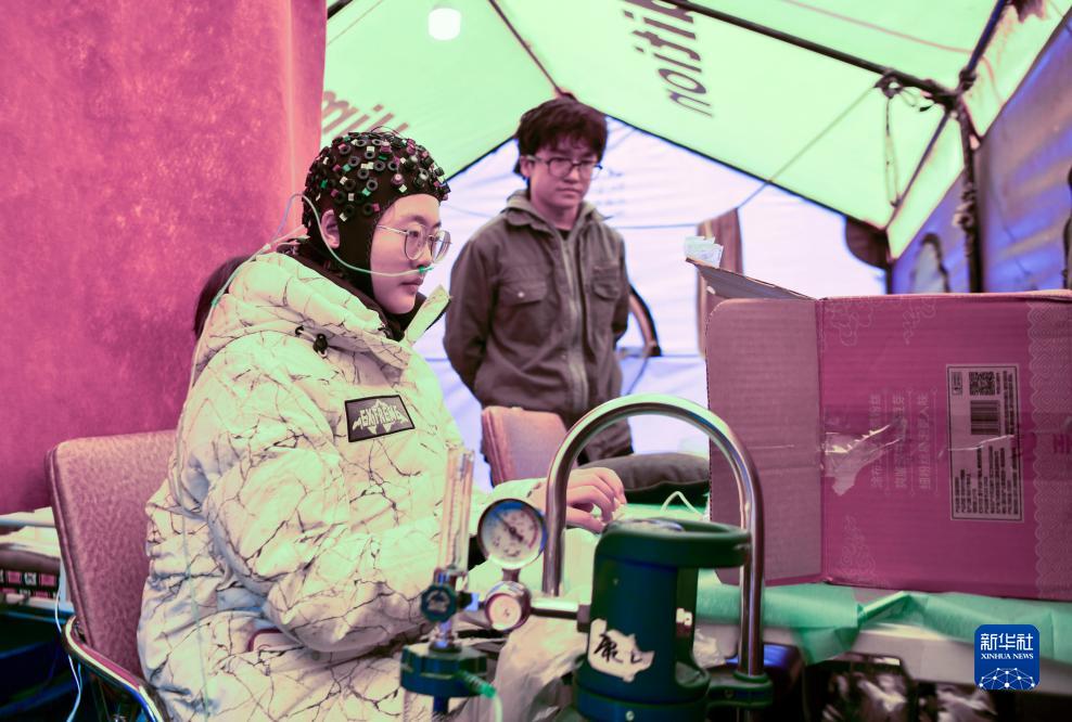 在卓奧友峰登山大本營,科考隊員(前)佩戴全腦彈性測試帽,測試有氧和無氧狀態(tài)下的人體認(rèn)知能力(9月29日攝)。新華社記者 晉美多吉 攝