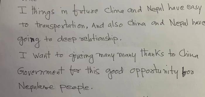 國(guó)之交在于民相親,民相親在于心相通。采訪過(guò)后,這位老人認(rèn)認(rèn)真真地用英文寫下一封信并交給中新網(wǎng)記者。他說(shuō):“我相信,未來(lái)中尼交通將更加便利,兩國(guó)情誼將更加深厚。我非常、非常地感謝中國(guó)政府,為尼泊爾人民帶來(lái)了這些大好機(jī)會(huì)。”