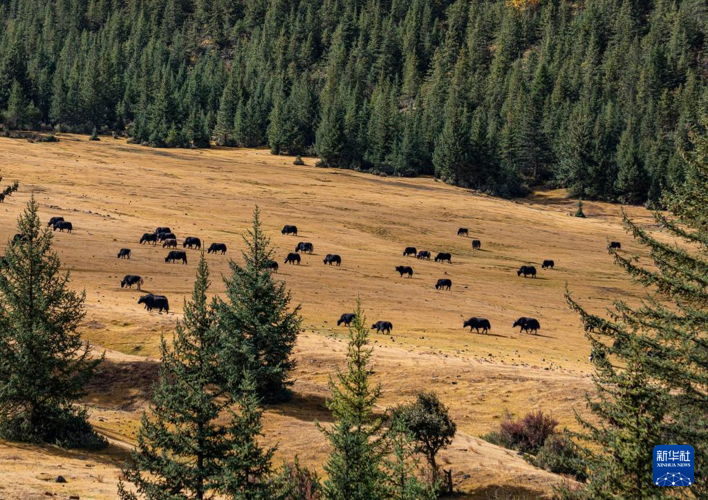 這是在西藏芒康縣如美鎮(zhèn)拉烏村附近拍攝的牧場(chǎng)風(fēng)光(10月20日攝)。新華社記者 孫非 攝