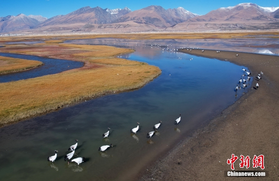 10月23日,成群的黑頸鶴在拉薩市當雄縣阿熱濕地內(nèi)覓食。黑頸鶴是全球十五種鶴類中,唯一在高原地區(qū)繁殖和越冬的鶴類,屬中國國家一級保護野生動物。(無人機照片)
